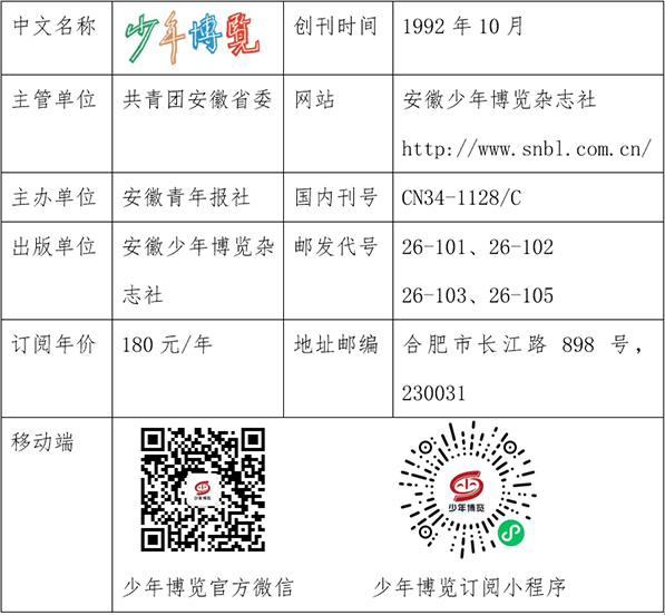 《少年博览》全年定价180元,《少年博览·小学低年级版》邮发代号26-103,《少年博览·小学中高年级版》邮发代号26-101,《少年博览·科学与创想》邮发代号26-103,《少年博览·阅读与写作》邮发代号26-105,可在全国各地邮局订阅,也可扫码进入微信小程序订阅。